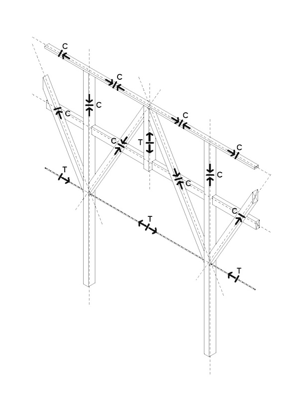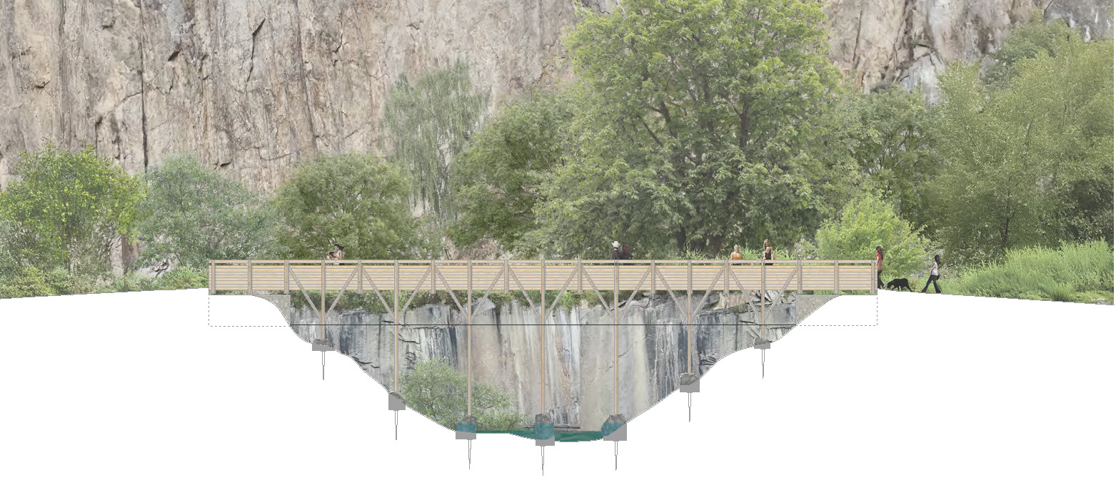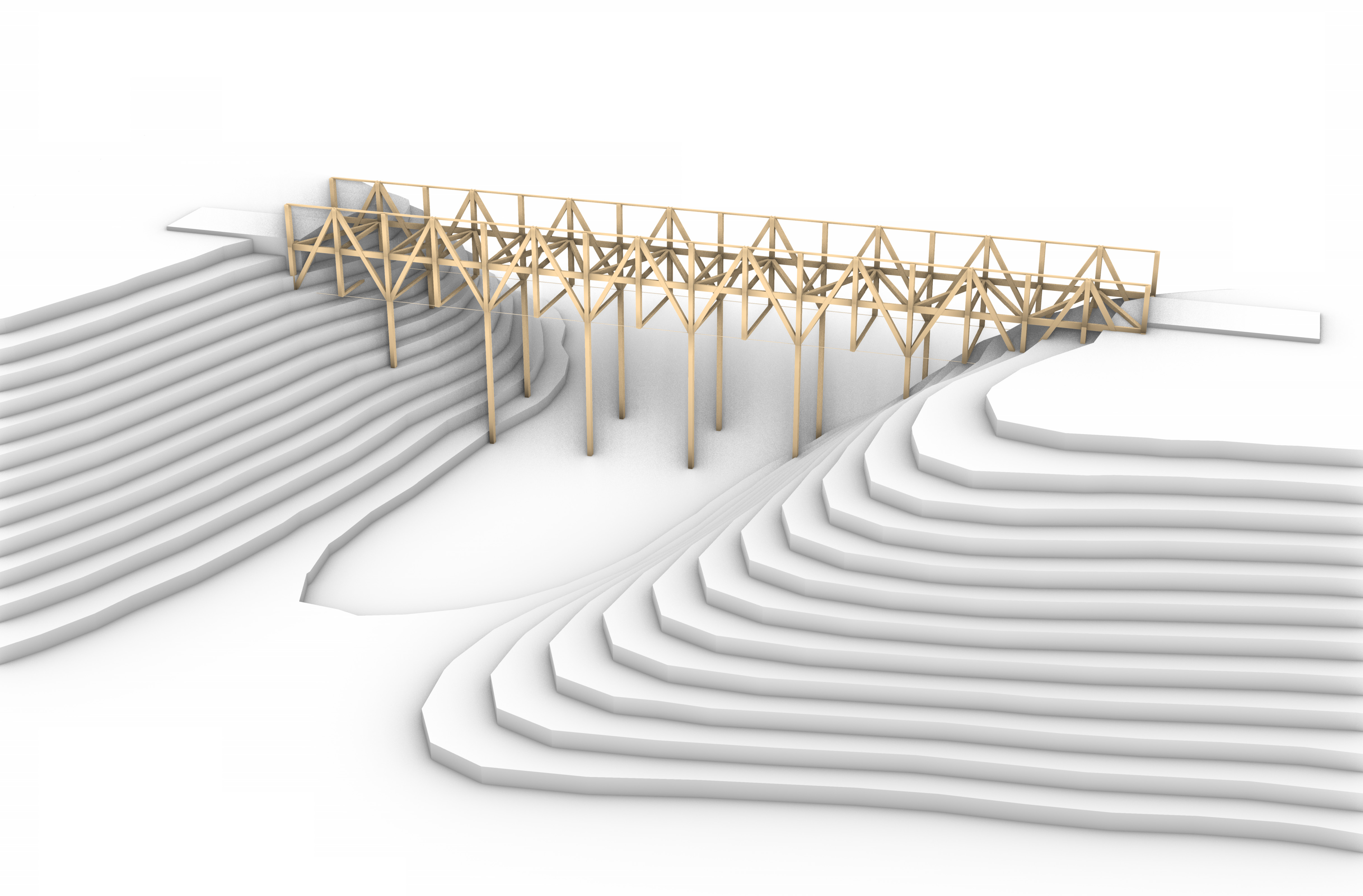 Designet består af et enkelt, gentagende system af trærammer, der forgrener sig i gitterlignende strukturer og derved skaber både robusthed og visuel lethed. Tilgangen trækker på den strukturelle logik fra traditionel infrastruktur ved udvindingssteder, hvilket giver konstruktionen en fornemmelse af genkendelighed og tidløshed. Materialerne afspejler og hylder den lokale kontekst, og tilsammen gør dette, at broen falder naturligt ind i landskabet og forstærker oplevelsen af at besøge dette historiske område.