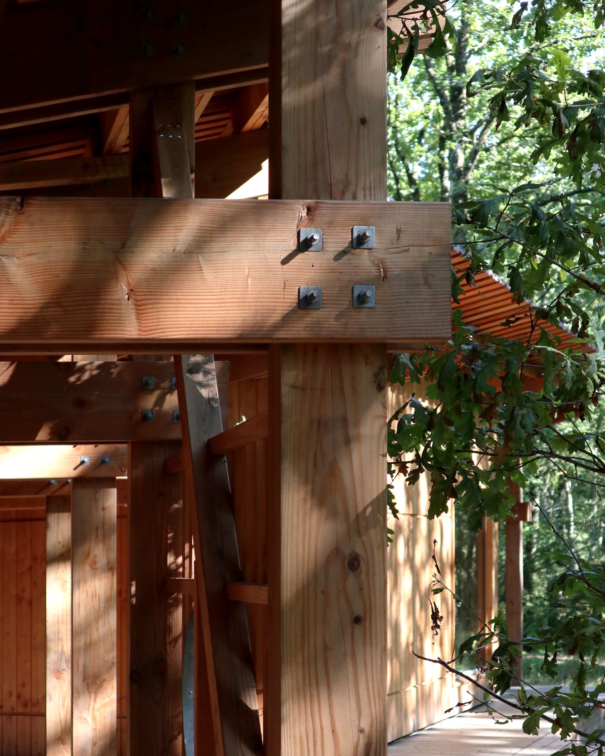 Trailcenter Bornholm er en åben trækonstruktion som funderes på klippebund. Det er designet som en platform, der strækker sine arme ud i naturen med minimal indgriben i den eksisterende skov omkring den. Under projektering har vi bl.a. benyttet os af et parametrisk workflow, med hvilket geometriens bæreevne og stabilitet eftervises vha. Karamba3d og Grasshopper. Det var også stor fokus på samlinger, med løsning af genbrugsmaterialer og skruesamlinger.