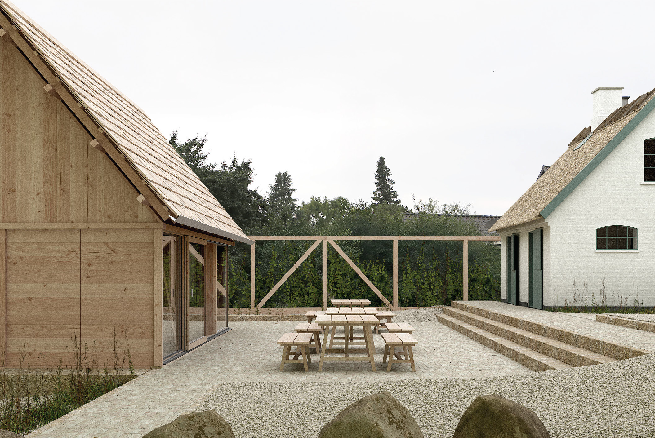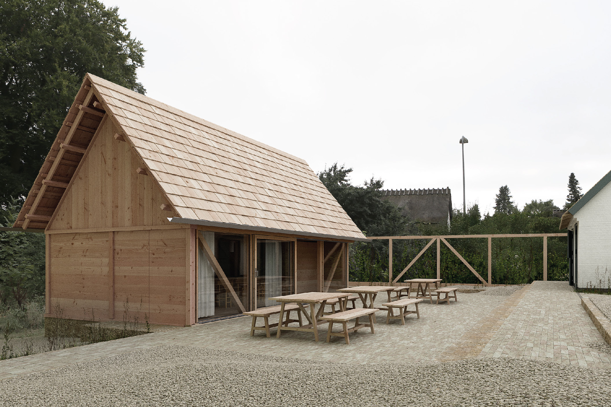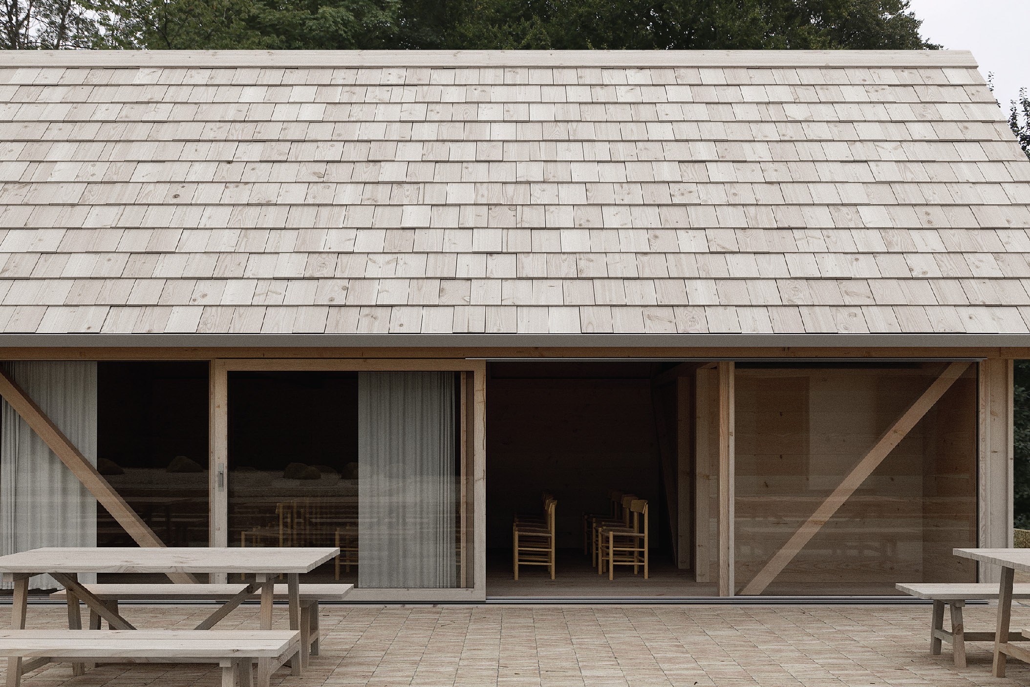 Med tydelig reference til de gamle bulhuse og traditionelle samlingsteknikker står Laden med tektonisk klarhed og en læsbar trækonstruktion. Store ambitioner og et eksperimenterende udgangspunkt danner rammen for vores arbejde med udvikling, dokumentation og forståelse af statikken forbundet med tømmersamlinger og traditionel byggeskik. Vi brænder for trækonstruktioner, og det er en fornøjelse at bygge videre på gamle principper og arbejde med tømmeret i sin simpleste og reneste form. Vi ser frem til at følge samt være en del af de næste skridt.